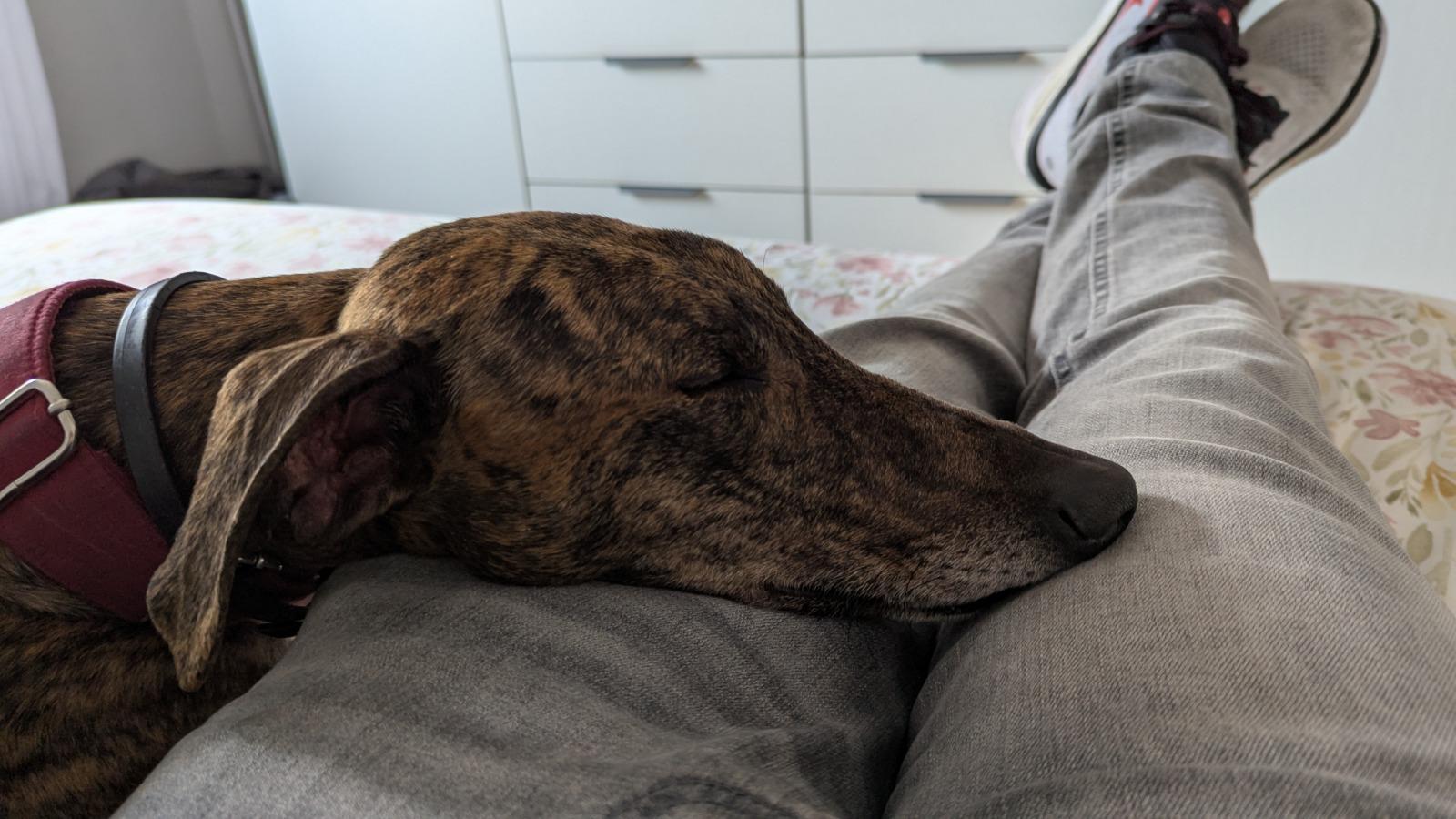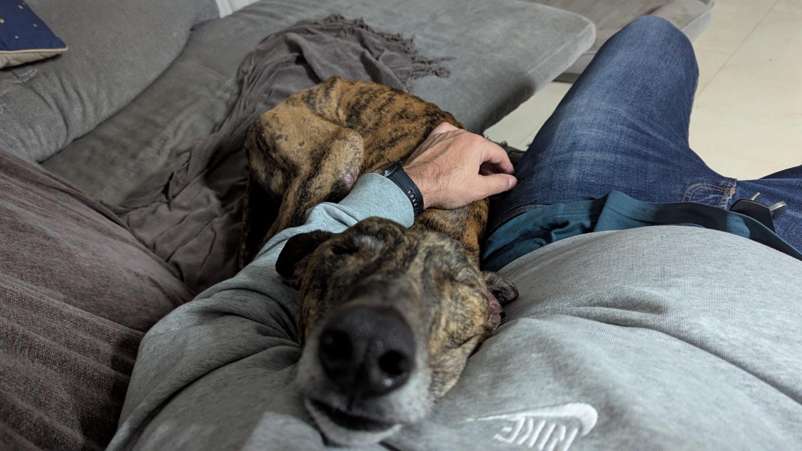 Hij woont nu bij een liefdevol pleeggezin samen met een andere Galgo, waar hij volop geniet van huiselijke warmte en aandacht.