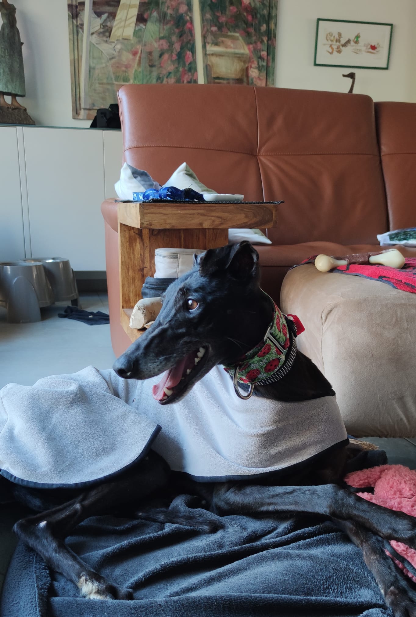 Grâce au soutien de ses compagnons, Golina s'est adaptée très rapidement à la vie en maison. Elle a été propre dès le premier jour, dort sagement dans son panier ou sur le fauteuil pour chien et sait exactement où se trouve sa nourriture. En peu de temps, elle a également pris du poids et mange sa gamelle avec plaisir.