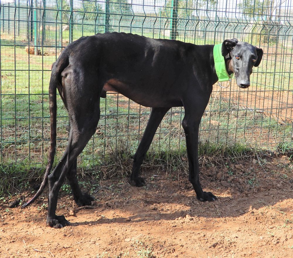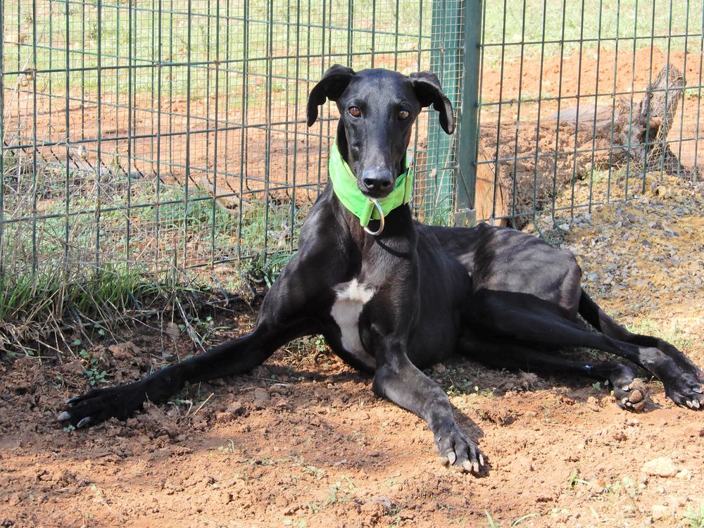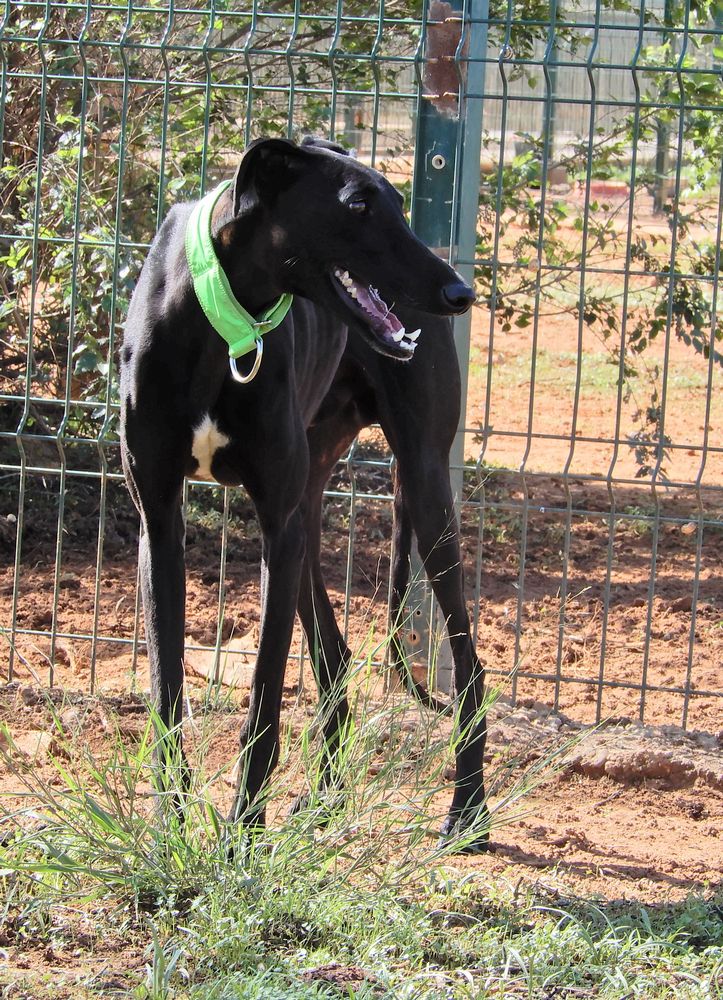 Fais la connaissance de Vento, un magnifique et tendre Galgo avec un pelage noir brillant.