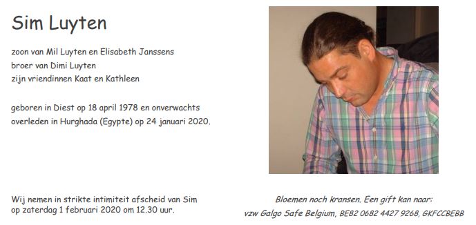 Sim était un jeune homme de Scherpenheuvel qui est décédé brutalement le 24 janvier 2020. C’était un grand ami des animaux, selon ses parents. Il avait déjà travaillé comme bénévole dans différents refuges espagnols. Sa famille n’a pas voulu de fleurs ni de couronnes lors de son enterrement. Ils ont préféré faire un don à notre association. Grâce à cet argent, nous pourrions aider les Galgo’s. Un beau geste de leur part dans un moment aussi difficile. Nous voulons remercier les personnes suivantes pour leur participation: