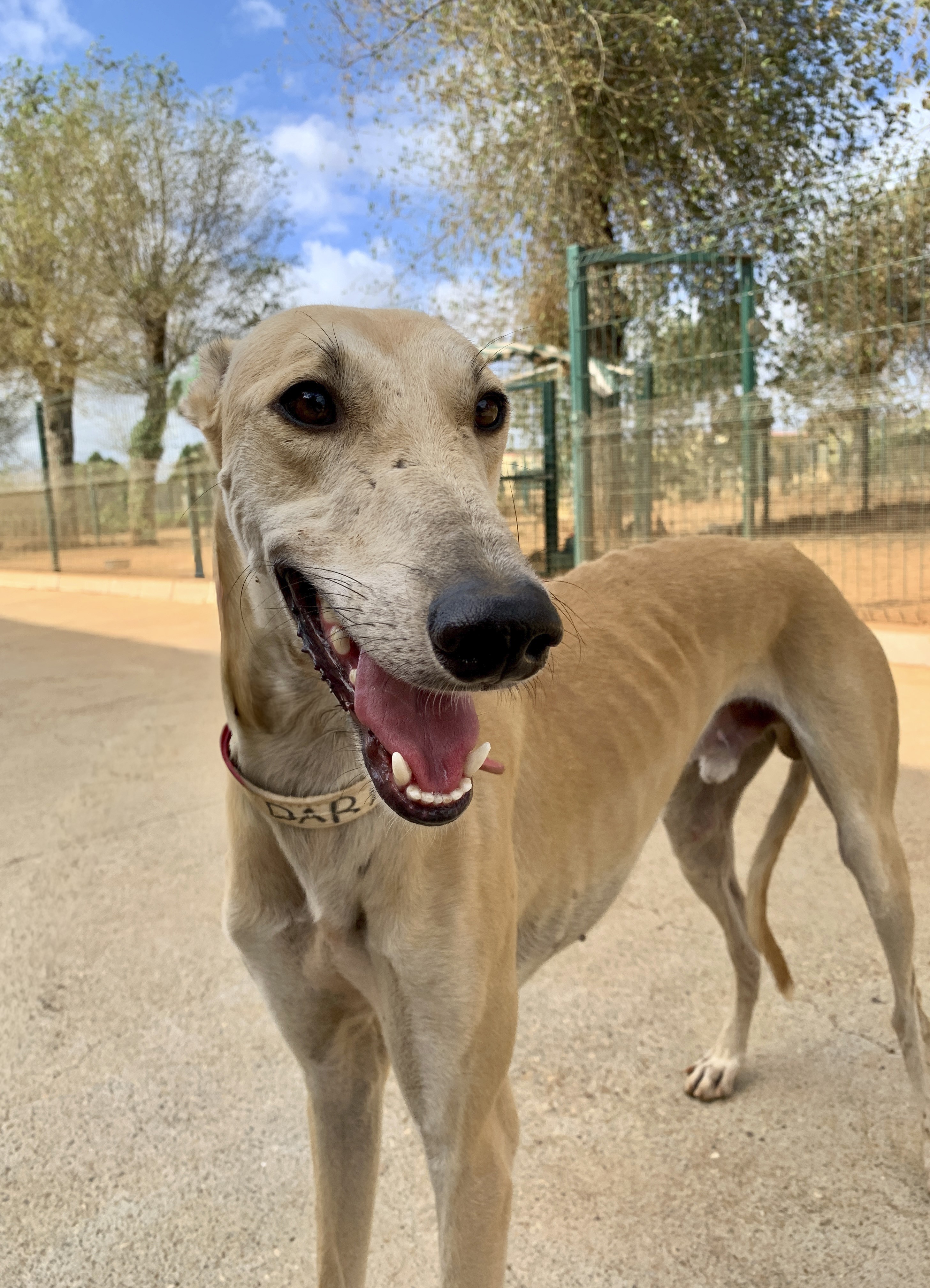 Dario is sociaal naar andere honden en zou duidelijk baat hebben bij de aanwezigheid van een sociale,stabiele Galgo/ grote hond in huis die hem houvast en steun biedt.